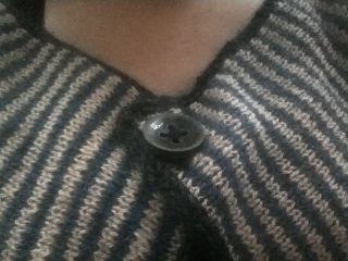 En enkel uppifrån-och-ner-kofta i bomullsgarn, Geopard baby cotton har jag för mig att det hette. Sen blev det söta små knappar med rävar på.
